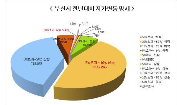 부산시 지가 총액은 전년 329조 1,361억원보다 3조 4,919억원 오른 363조 7,280억원으로 조사됐으며 해운대구는 평균 지가가 13.35% 상승해 가장 높은 변동률을 보였다.