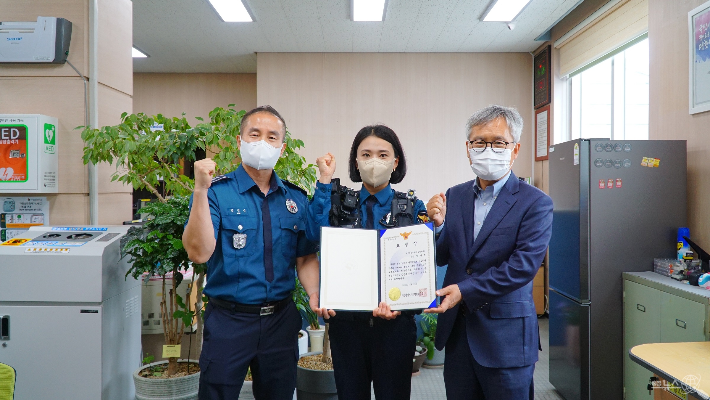 대전자치경찰위원회 강영욱 위원장은 지난29일 둔산경찰서 갈마지구대를 방문하여 자살기도자를 구조한 실습 여경에 대해 표창장을 수여하고 현장 근무 경찰관들을 격려했다.