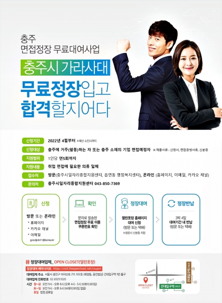 면접 정장 무료 대여 신청은 신분증, 면접 증빙자료 등 구비서류를 갖춰 충주시일자리종합지원센터 홈페이지 또는 카카오톡 채널을 통해 접수하면 된다.