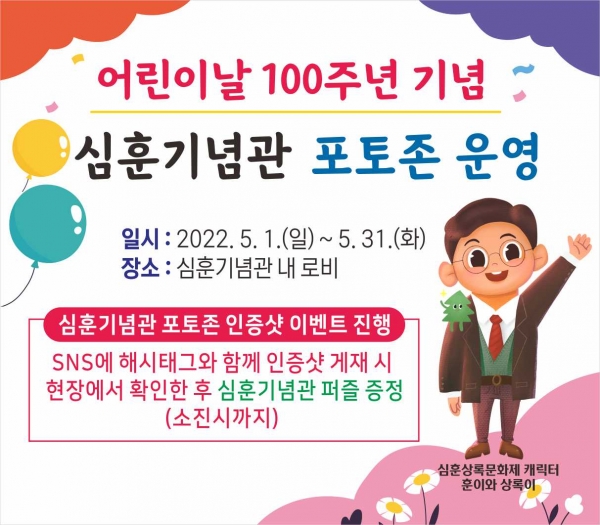심훈기념관 로비에 마련되는 포토존에는 심훈상록문화제 캐릭터 훈이, 상록이를 활용한 등신대와 방정환 선생과의 특별한 인연을 보여주는 ‘어린이날’ 시 소개 배너 및 관련 영상을 제공해 어린이날의 의미와 가치를 전달할 계획이라고 전했다.