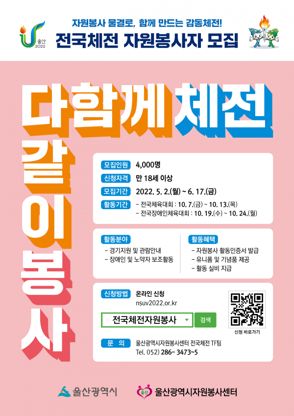 [충청뉴스큐] 울산시가 오는 10월 울산에서 열리는 제103회 전국체육대회와 제42회 전국장애인체육대회의 자원봉사자를 모집한다.
