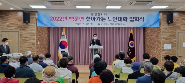 [충청뉴스큐] 대한노인회 제천시지회가 주관하는 2022년 찾아가는 노인대학이 지난 2일 백운면행정복지센터에서 60명의 입학생이 참석한 가운데 열렸다.