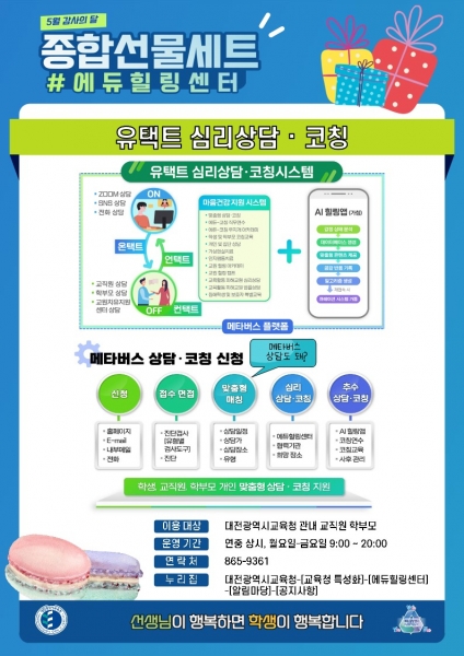 [충청뉴스큐] 대전광역시교육청은 에듀힐링센터 주관으로 학생, 학부모, 교직원의 심리회복 및 정서치유를 지원하기 위해 5월 감사의 달 종합선물세트를 선물한다고 3일 밝혔다.