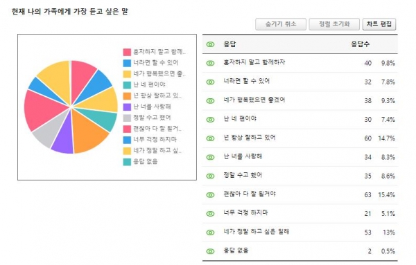 조사 결과 ‘가족에게 듣고 싶은 말’은 10대 ‘난 너를 사랑해’, 20대 ‘너라면 할 수 있어’ 30대 ‘넌 항상 잘하고 있어’, 40대 ‘괜찮아 다 잘 될 거야’, 50대 ‘정말 수고 했어’, 60대 ‘혼자하지 말고 함께하자’ 등이 가장 높은 비율을 차지했다.