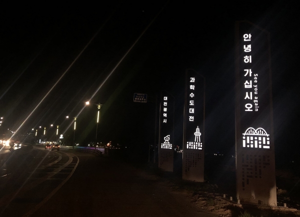 [충청뉴스큐] 대전시는 시 경계 안내사인을 친환경 태양광 LED로 전면 교체하고 야간경관 기능을 강화했다고 4일 밝혔다.