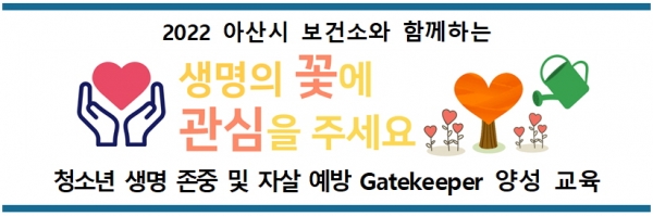[충청뉴스큐] 아산시보건소가 5월부터 관내 중고등학생을 대상으로 ‘2022 청소년 생명 존중 및 자살 예방 Gatekeeper 양성 교육’을 진행한다.