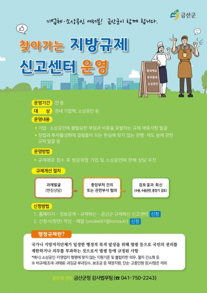 [충청뉴스큐] 금산군은 올해 관내 기업체, 소상공인 등의 불합리한 규제에 관한 의견을 듣고 해결방안을 모색하기 위해 찾아가는 지방규제 신고센터를 운영하고 있다.