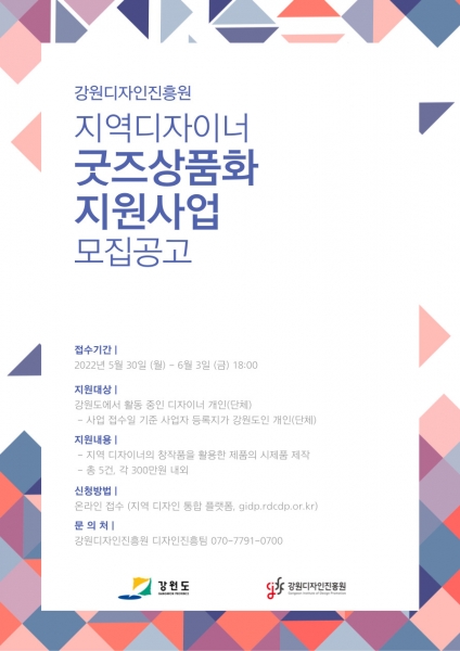 [충청뉴스큐] 강원디자인진흥원은 지역 디자이너에게 사업화 기회를 제공하기 위해 ‘지역 디자이너 굿즈 상품화 지원사업’을 추진한다.