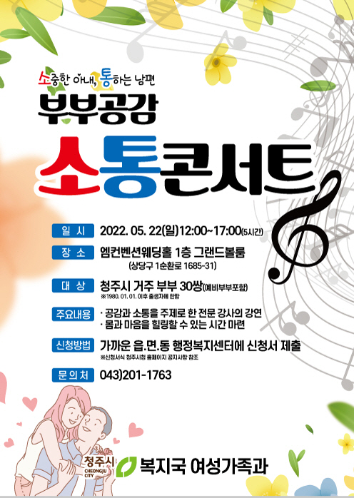 [충청뉴스큐] 청주시는 오는 5월 22일 낮 12시, 청주 엠컨벤션웨딩홀에서 부부공감 소통콘서트를 개최한다.