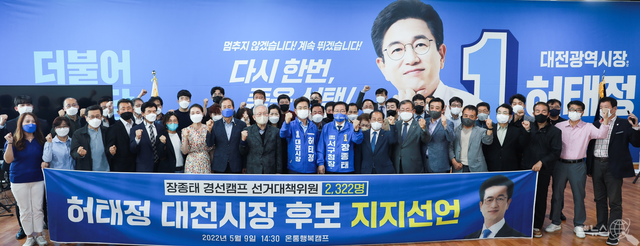 장종태 더불어민주당 서구청장 후보와 지지자 50여명이 9일 서구 둔산동 온통행복캠프를 방문하여 허태정 더불어민주당 대전시장 후보에 대한 지지를 선언하였다.