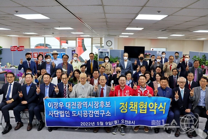 사단법인 도시공감연구소는 9일 이장우 국민의힘 대전시장 후보와 ‘대전발전 정책대안 연구·개발’을 위한 정책협약을 맺고 정책분야 지원을 약속했다.