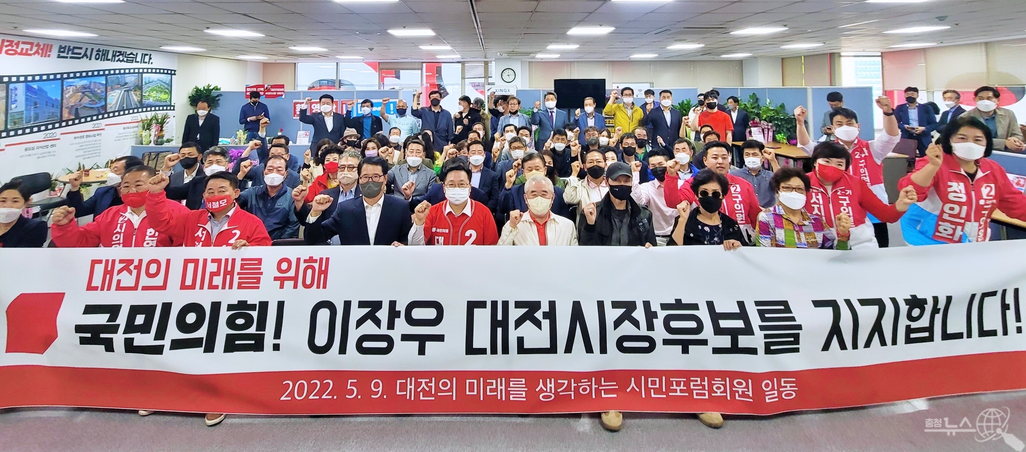 ‘대전의 미래를 생각하는 시민포럼’ 회원 200여 명은 지난9일 오후 서구 둔산동에 위치한 대전미래캠프를 찾아 이장우 국민의힘 대전시장 후보 지지를 선언했다.