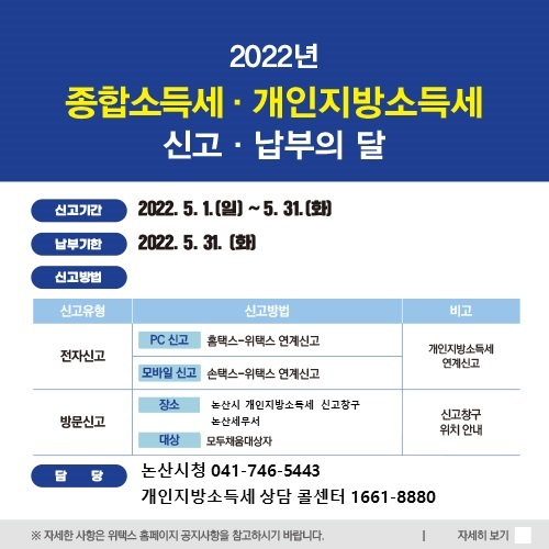 [충청뉴스큐] 논산시는 5월 한달 간 본청 1층에 종합소득세·개인지방소득세 합동도움창구를 설치·운영한다.