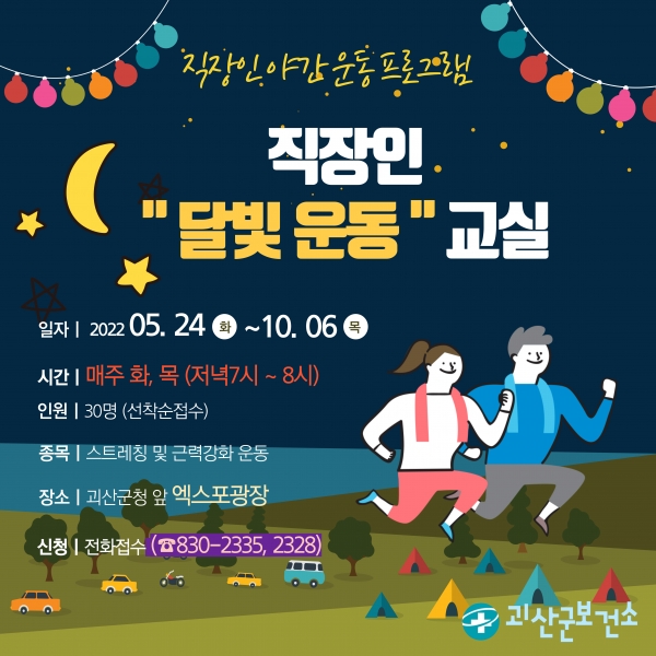 ‘직장인 달빛운동 교실’은 오는 24일부터 10월 6일까지 괴산군청 앞 엑스포광장에서 매주 화, 목 저녁 7시부터 8시까지 20주간 진행된다.