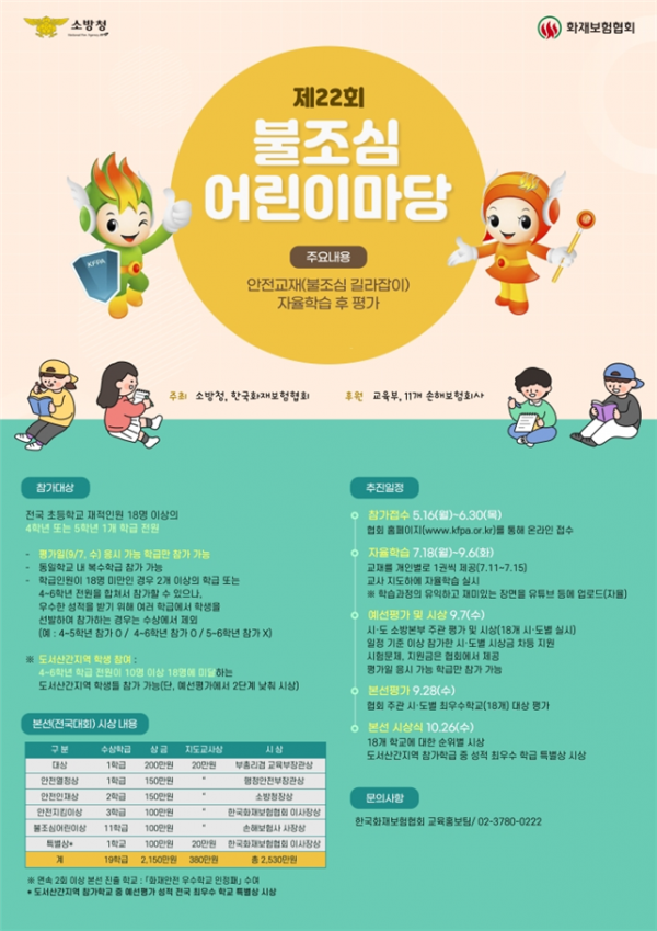 소방청과 한국화재보험협회가 공동 주최하는 ‘불조심 어린이 마당’은 어린이들에게 화재와 생활안전에 관한 기초지식을 습득하게 해 안전한 생활의 기회를 제공하고 안전문화 확산에 기여하고자 기획됐다.