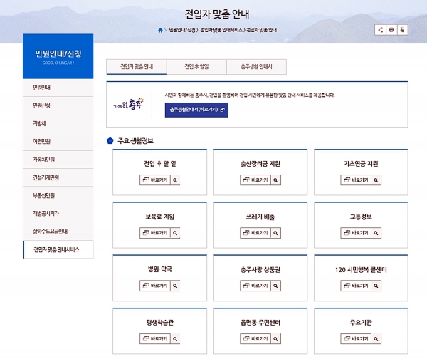 ‘전입자 맞춤 안내 서비스’는 ‘충주시 홈페이지"민원안내/신청 "전입자 맞춤 안내’에서 확인할 수 있다.