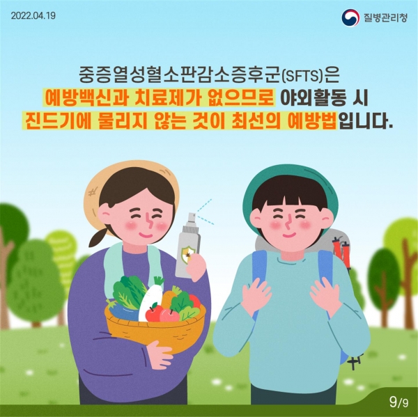4월부터 11월에 주로 발생하는 중증열성혈소판감소증후군는 SFTS바이러스를 보유한 진드기에 물려 발병되며 예방백신과 치료제가 없어 야외활동 시 진드기에 물리지 않는 것이 최선의 예방법이다.