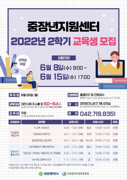 [충청뉴스큐] 대전시 중장년지원센터는 중장년을 대상으로 하는 직업훈련 개발교육과 문화여가 활동교육 수강생을 오는 6월 8일부터 6월 15일까지 모집한다고 밝혔다.