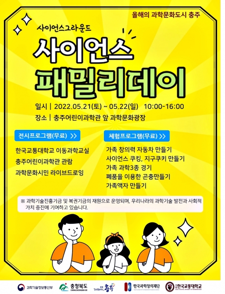[충청뉴스큐] 2022년 올해의 과학문화도시 충주의 5월 과학문화행사로 오는 21일과 22일 양일간 ‘사이언스 그라운드’ 가족 과학체험행사가 열린다.