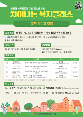 [충청뉴스큐] 인천시사회서비스원은 ‘엔데믹 시대, 새로운 희망을 품다-지속가능한 공동체 톺아보기’를 주제로 사회복지 시민교육 ‘차이나는 복지클래스’에 참여할 시민을 모집한다고 18일 밝혔다.