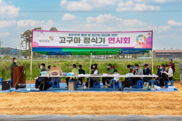 [충청뉴스큐] 당진시가 수작업으로 하던 고구마 정식, 줄기제초 및 수확 등을 기계화해 생산비를 획기적으로 줄이고 일손 부족 문제를 해결할 수 있는 ‘고구마 정식기 연시회’를 지난 18일 송산면 금암리 일원에서 개최했다.