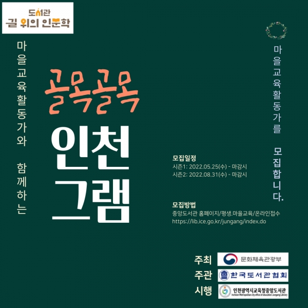 [충청뉴스큐] 인천광역시교육청중앙도서관은 문화체육관광부가 주최하고 한국도서관협회가 주관하는 2022년 도서관 길 위의 인문학 공모사업에 선정돼 25일부터 수강생을 모집한다.