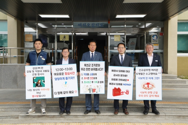 이날 캠페인에는 갑질 및 직장 내 괴롭힘 근절, 시보 떡·애경사 답례품 근절 등 조직문화 개선과 비효율적인 행정관행과 잘못된 조직문화를 변화시키자는 피켓을 들고 출퇴근하는 직원들에게 메시지를 전달했다.