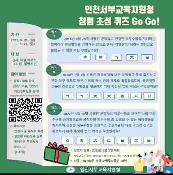 [충청뉴스큐] 인천서부교육지원청은 청렴 문화 확산을 위해 학생, 학부모, 시민들을 대상으로 27일까지 청렴 초성 퀴즈 이벤트를 실시한다.