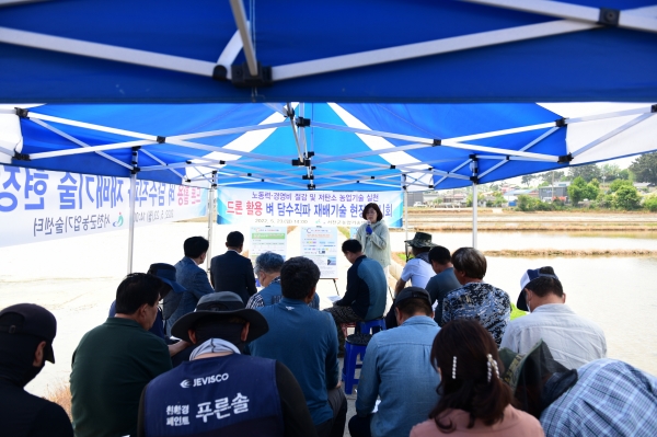 특히 조류 피해 최소화와 입모율 향상을 위한 종자 철분코팅 기술과 드론직파에 맞는 종자 파종량 및 파종시기, 논 작업 체계 등 핵심기술을 전달해 농가의 궁금증을 현장에서 해결했다.