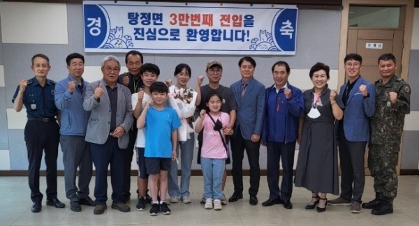 [충청뉴스큐] 탕정면이 지난 24일 심흥섭 탕정면장을 비롯해 김백수 이장협의회장, 엄신호 주민자치회장, 송현순 행복키움단장, 류인명 새마을금고 이사장, 이한경 탕정농협 조합장 등 지역 기관 단체장들이 참석한 가운데 3만 번째 전입 주인공을 축하하고 기념하는 시간을 가졌다.