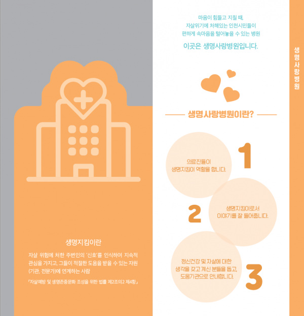 ‘생명사랑병원’은 병원 내 의료인이 생명지킴이가 되어 병원에 내원한 시민들의 자살위험을 살피고 자살고위험군은 도움기관으로 연계하는 역할을 수행한다.