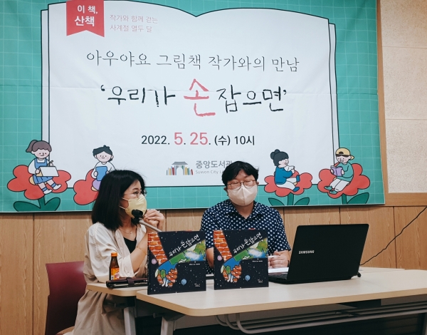 ‘2022 경기도 문화의 날’ 문화예술 지원 프로그램인 이번 강연은 그림책 ‘우리가 손잡으면’을 집필한 아우야요 작가가 시민 50여명을 대상으로 대면·비대면 병행 방식으로 진행했다.