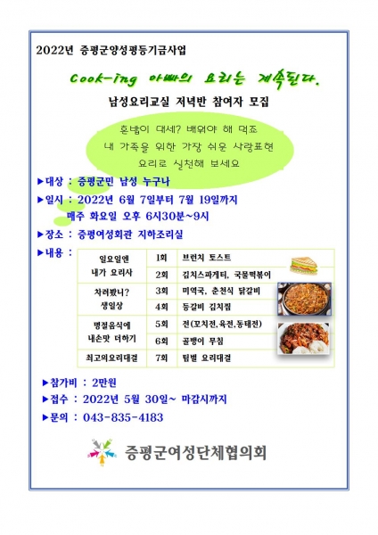[충청뉴스큐] 증평군 여성단체협의회는 남성요리교실 참여자를 모집한다.