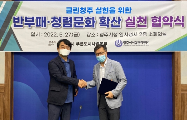 [충청뉴스큐] 청주시 산림관리과가 27일 반부패·청렴문화 확산을 위해 청주시시설관리공단과 청렴협약을 체결했다고 밝혔다.
