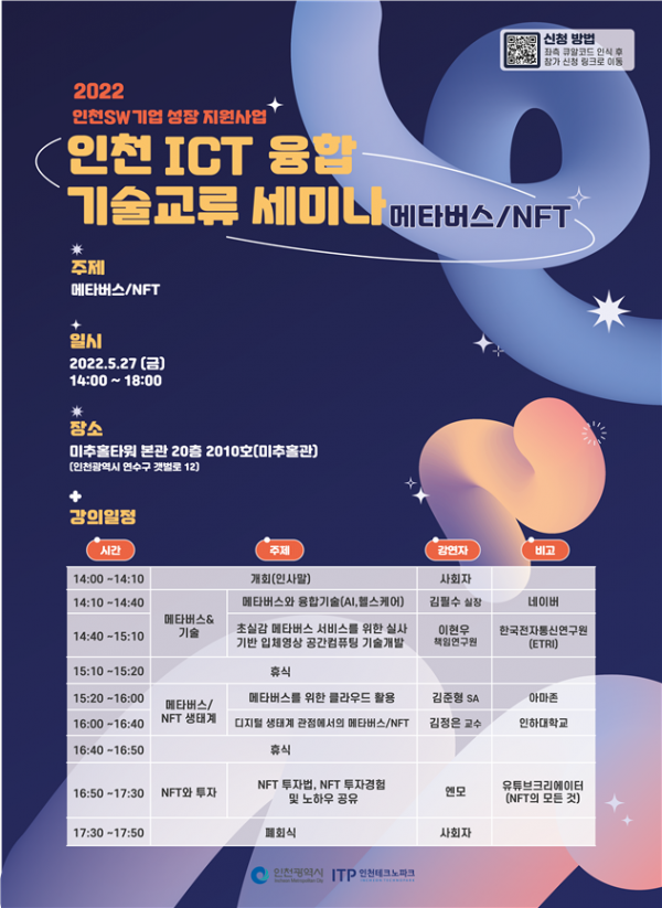 [충청뉴스큐] 인천광역시는 27일 송도 미추홀타워에서 정보통신기술 융합기술의 트렌드를 공유하고 산업 경쟁력 강화를 위한 ‘인천 정보통신기술 융합 기술교류 세미나: 메타버스/대체불가능토큰’를 개최했다고 밝혔다.