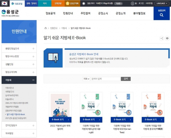 한편 군은 충북혁신도시 조성과 다수의 산업단지 유치에 따라 빠르게 증가하는 행정수요에 대응하고자 매년 1천 부 이상의 지방세 안내 책자를 제작해 발간하고 있다.