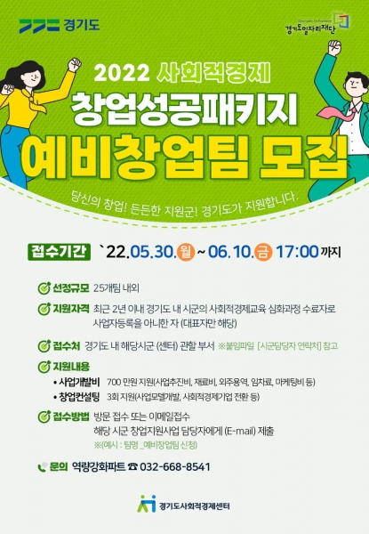 [충청뉴스큐] 경기도일자리재단 경기도사회적경제센터가 사회적경제기업 예비창업자의 단계별 성장을 지원하기 위해 다음 달 10일까지 25개 예비창업팀을 모집한다.