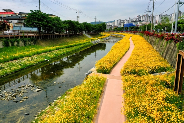 지난해 시에서 하소천에 금계국 25만본을 식재했고 지속적인 관리와 노력의 결실로 올해 금계국 개화 시기에 맞춰 천만송이의 금계국이 만개해 꽃의 향연이 펼쳐지고 있다.