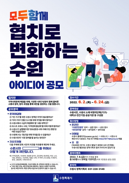 [충청뉴스큐] 수원시가 6월 2일부터 24일까지 ‘2022년 수원시 협치 아이디어’를 공모한다.