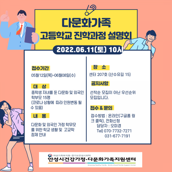 [충청뉴스큐] 안성시는 자녀들의 중·고등학교 진학 정보 부족으로 어려움을 겪는 다문화가족을 위해 경기도와 경기도교육청이 함께하는 ‘다문화가족 진학 과정 설명회’를 오는 6월 11일 안성시건강가정다문화가족지원센터에서 개최한다.