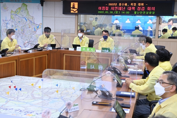 조청식 권한대행은 5월 30일 시청 재난안전상황실에서 ‘2022년 여름철 자연재난 대책 점검회의’를 주재하고 “아무리 대비를 잘해도 자연재난은 예상하지 못한 곳에서 발생할 수 있다”며 “재난이 발생하면 현장과 가까이 있는 직원이 즉시 적절하게 대응한 후 상황을 전파하라”고 강조했다.