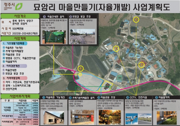 시에서 추진하는 문의면 묘암리 마을만들기 사업은 2021년에 예비계획지구로 선정해 2022년부터 2024년까지 3년간 5억원을 투자하는 사업이다.