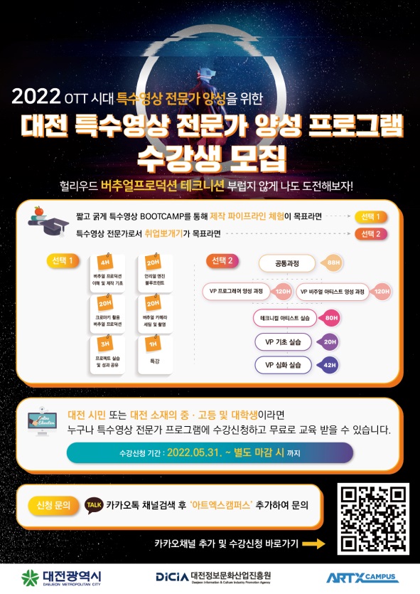 이번 교육 프로그램은 특수영상에 관심 있는 대전시민이면 참여가능하며 5월 31일부터 카카오톡 채널에서 ‘아트엑스 캠퍼스’를 검색해 추가하거나 홍보물 QR코드를 통해 신청할 수 있다.
