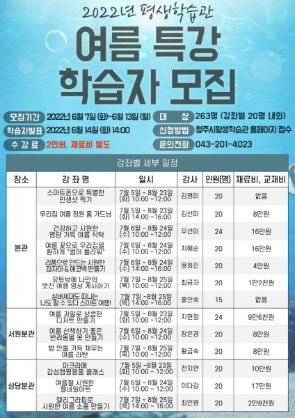 [충청뉴스큐] 청주시평생학습관이 무더운 여름철 배움의 장 마련을 위해 오는 6월 7일부터 13일까지 ‘2022년 여름 테마특강 프로그램’에 참여할 학습자 263명을 모집한다.