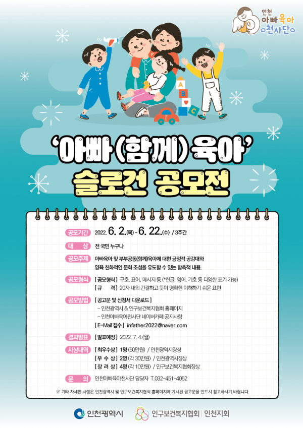 [충청뉴스큐] 인천광역시는 오는 6월 22일까지 ‘2022년 아빠육아 슬로건 공모전’을 개최한다고 밝혔다.