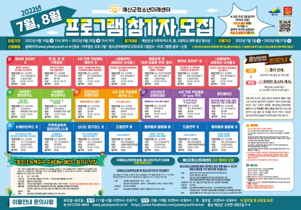 [충청뉴스큐] 예산군 청소년수련관과 청소년미래센터는 코로나19로 활동이 위축된 관내 청소년의 건강한 성장 지원을 위해 오는 7~8월부터 운영하는 다양한 프로그램의 참가자를 모집한다고 밝혔다.