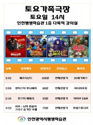 [충청뉴스큐] 인천평생학습관에서는 겨울방학을 맞이해 가족이 함께 즐거운 주말을 보낼 수 있도록 매주 토요일 오후 2시 다목적강의실에서 가족 영화를 상영한다.