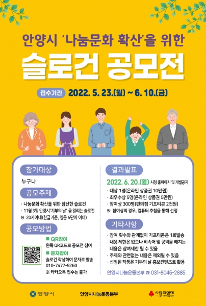 [충청뉴스큐] 안양시나눔운동본부가 오는 11월 3일‘기부의 날’에 활용할 나눔문화 확산 슬로건을 공모한다고 안양시가 2일 밝혔다.