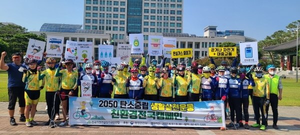 [충청뉴스큐] 전국자전거길잇기국민연합와 ㈔자전거사랑전국연합회 대전본부는 2일 오후 오후 2시30분 대전시청남문 잔디광장에서 회원과 시민들이 참석한 가운데 2050 탄소중립 실천운동 전국자전거 캠페인을 실시했다.