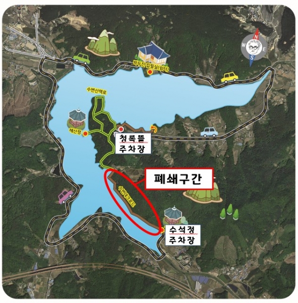 임시 폐쇄 기간은 오는 6월 13일부터 7월 중순까지이며 폐쇄 구간은 수변데크 산책로 약 1km로 수석정에서부터 강건너빼리까지의 구간이다.